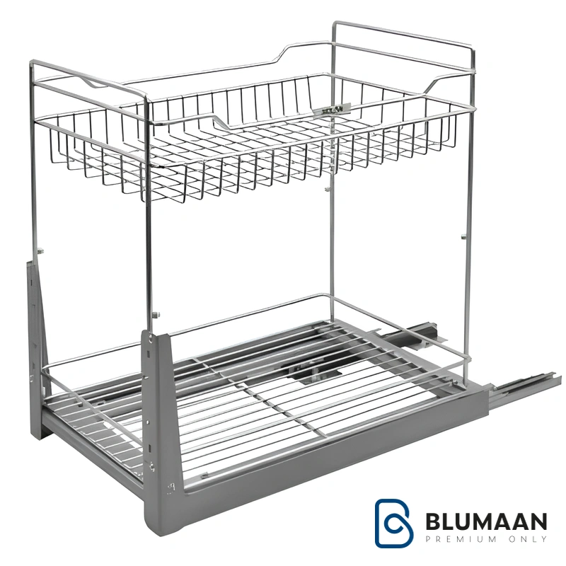 این سبدها در یونیتهای مختلف 300mm, 350mm, 400mm, 450mm, 500mm و 600mm عرضه میشوند و با ارتفاع 540mm، طول 510mm و عرضهای متغیر (235mm, 285mm, 335mm, 385mm, 435mm, 535mm) متناسب با نیاز شما قابل انتخاب هستند. این تنوع ابعاد، امکان نصب سبد را در فضاهای مختلف آشپزخانه و کمد فراهم میکند.