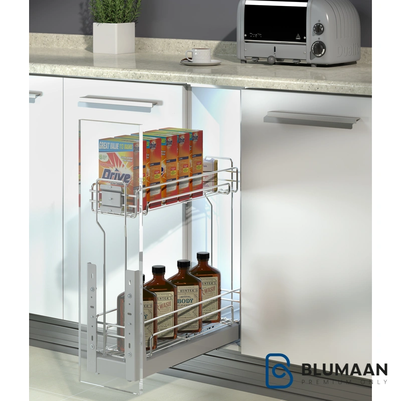 سبد مواد شوینده کف ریل دو طبقه پلاتین، راهحلی ایدهآل برای سازماندهی و دسترسی آسان به مواد شوینده در آشپزخانه شما.